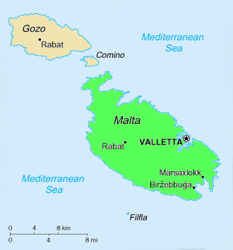 De Republiek Malta ligt in het midden van de Middellandse Zee. Het is ongeveer 15 km breed en 25 km lang. Dus het is ongeveer 320 km2.